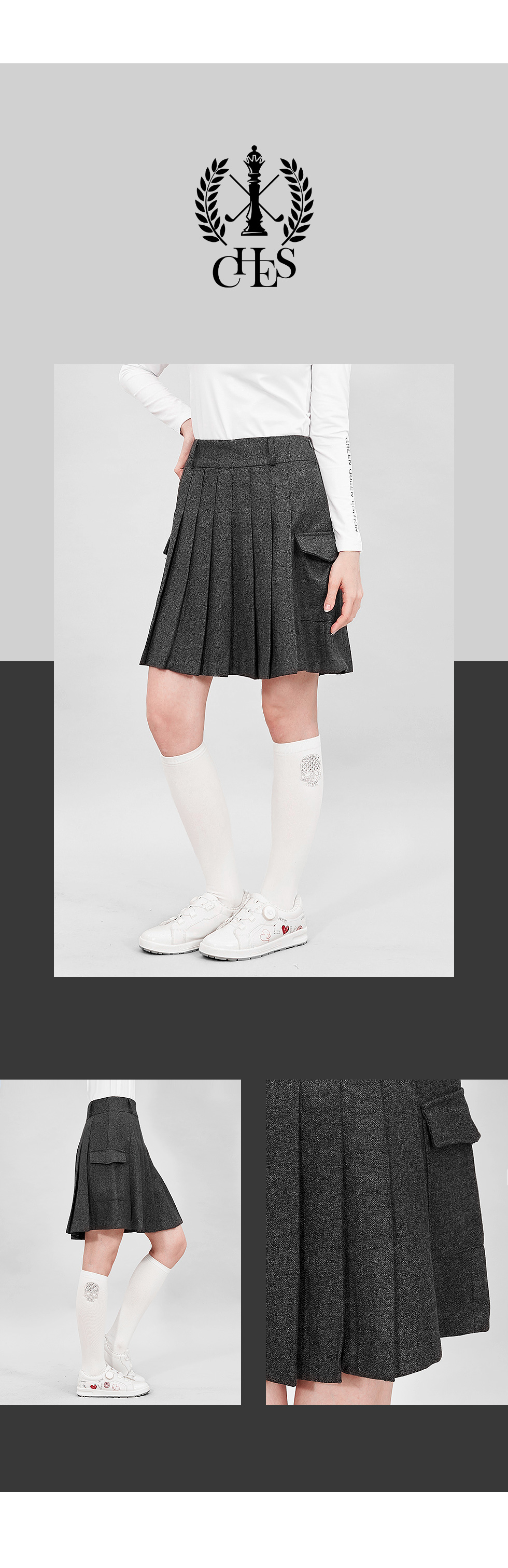 * 무릎 위까지 오는 롱기장에 자연스럽게 퍼지는 플리츠 라인이 체형 보완에도 탁월