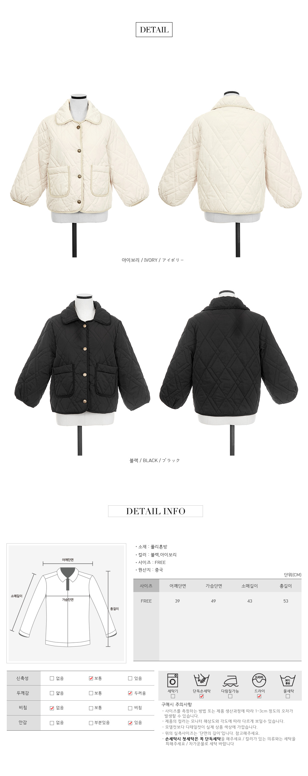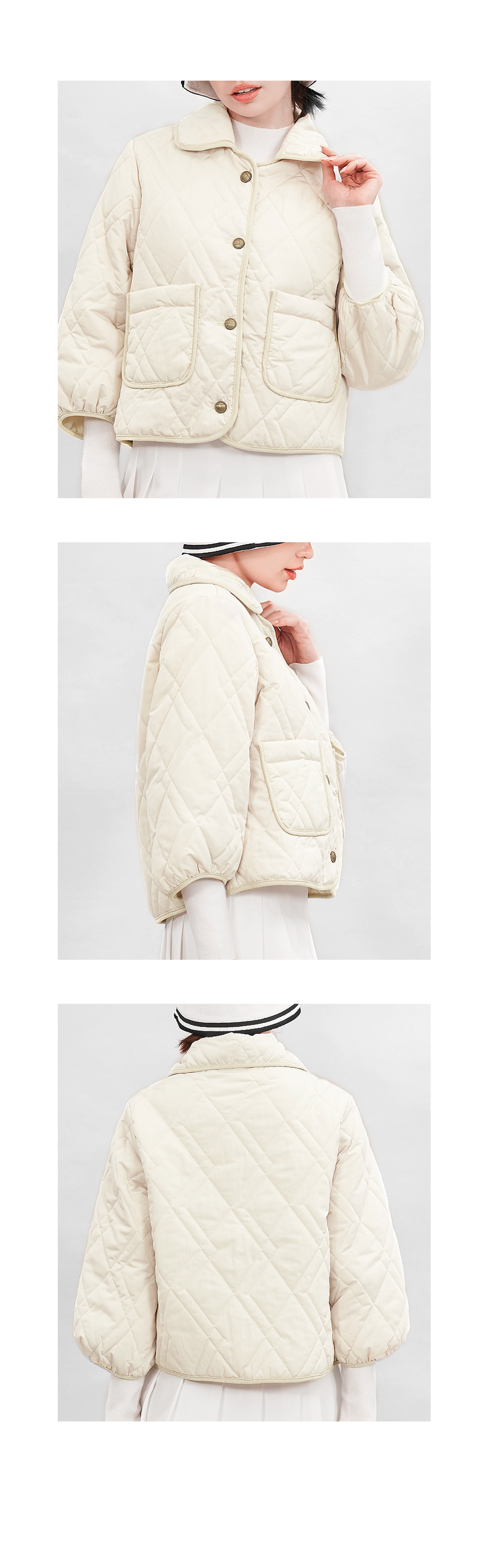 * 3온스 퀄팅 패딩으로 가볍고 부담 없이 착용하기 좋아 간절기 시즌에 활용도 높은 아우터