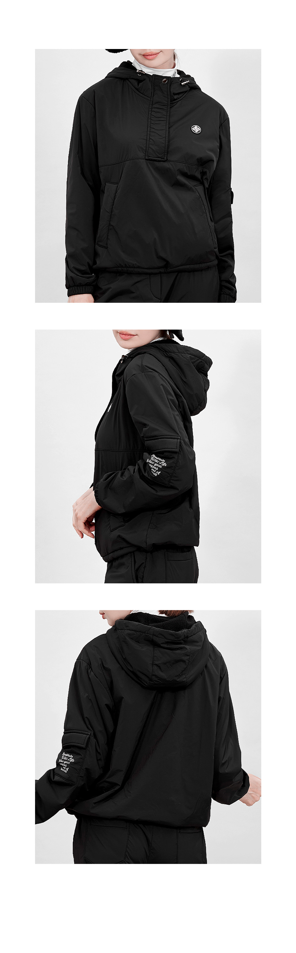 * 반집업 스타일에 후드모자와 하이넥 디자인이 더해져 바람을 잘 막아주는 디자인